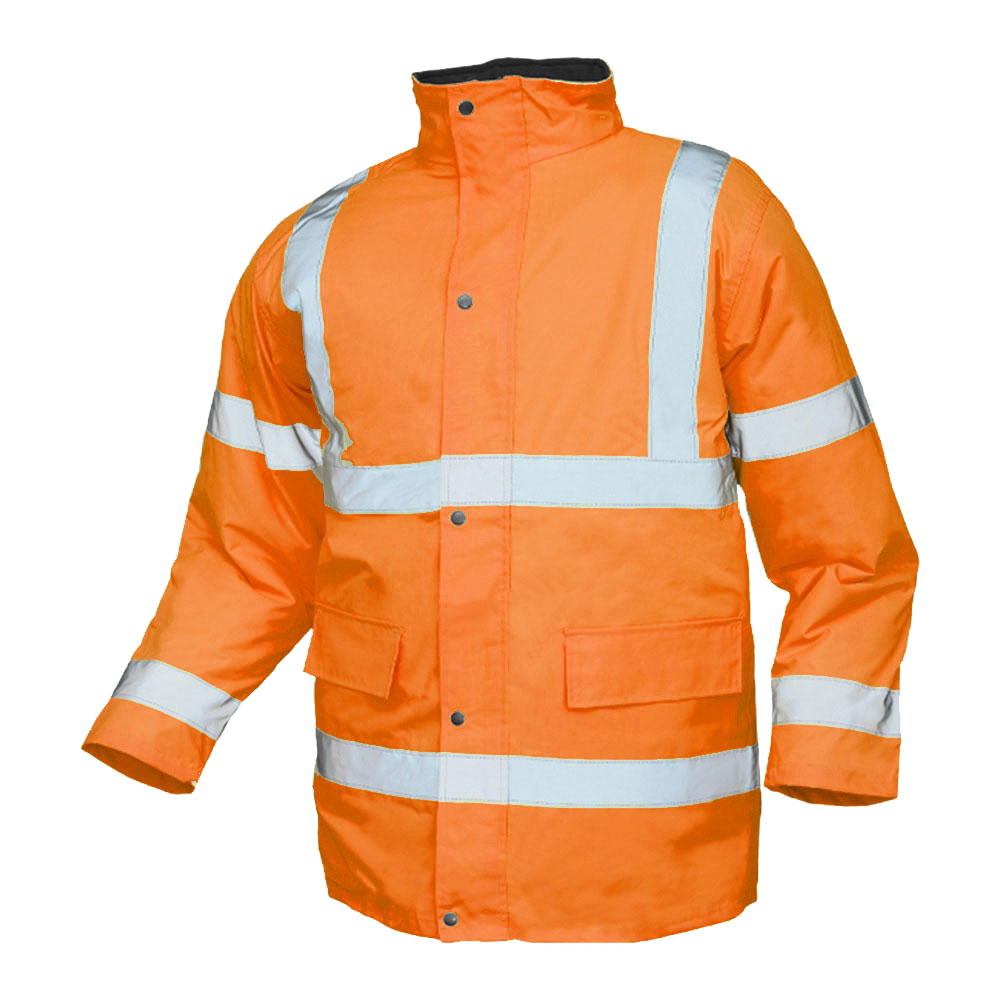 A waterproof and windproof jacket with reflective bands. Perfect for outdoor work including landscaping, road and building sites.
