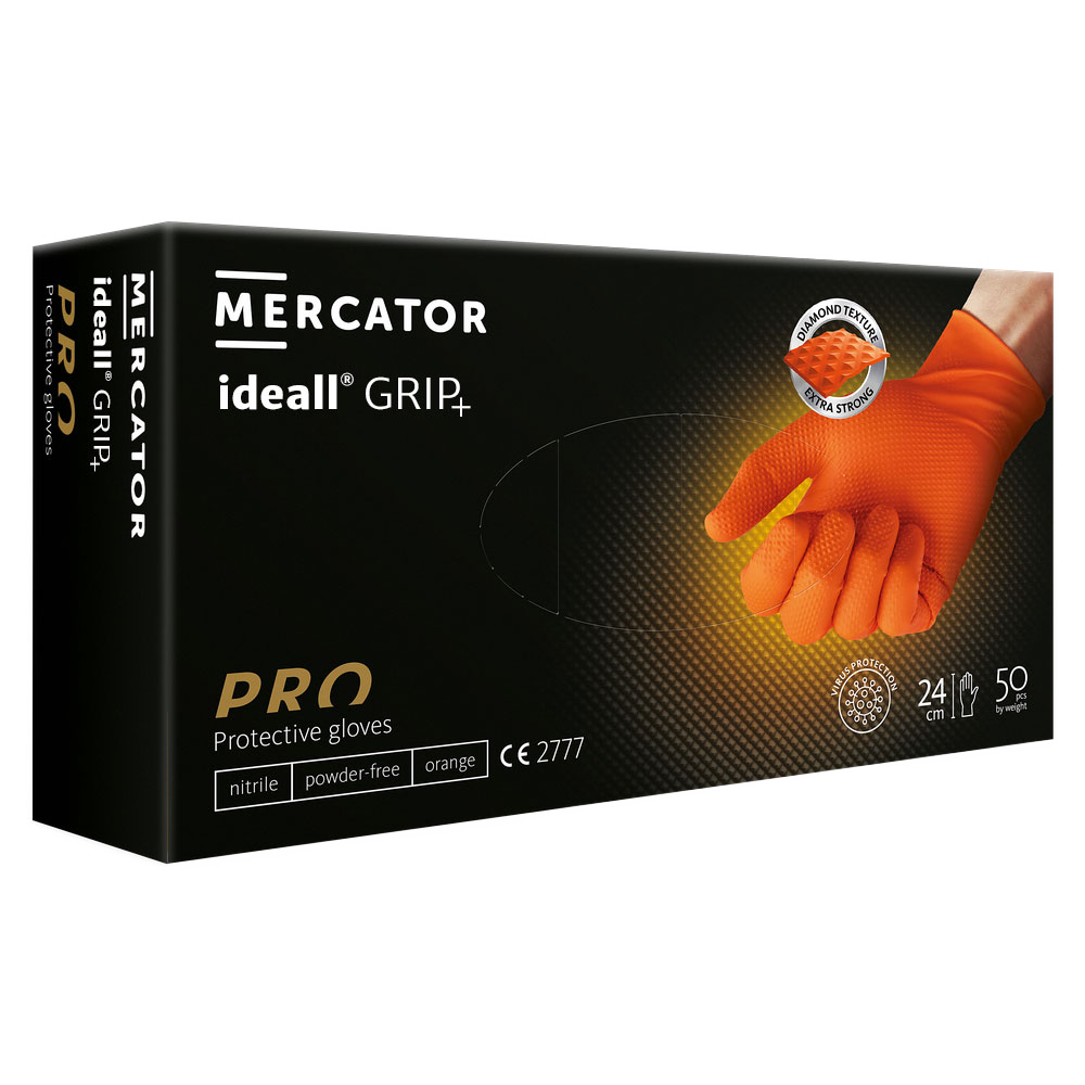 The Mercator Medical Orange Ideall® Grip is a 7.0 mil, 8.6 gram, 240mm long orange nitrile, type B glove. This product features a diamond texture grip on the inner and outer offering great traction grip.